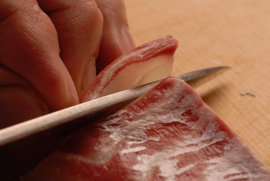 上からの圧力、刃の長い直線、下ろす角度、引くスピード、よく切れる包丁で的確に切ると細胞から旨みが逃げ出しません。活け絞めされた生体組織を切る、つまり繊維を切るわけですから、切断面が細かければ細かいほど細胞が壊れずに、エキスを失わないということです。